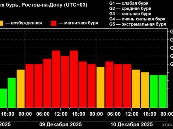 Как сообщили в Лаборатории солнечной астрономии, хотя сила самой солнечной вспышки была умеренной, она была направлена прямо в сторону Земли. Ожидается, что буря достигнет уровня G2-G3 по пятибалльной шкале — это средние и сильные возмущения. Пик активности прогнозируется во второй половине дня 9 декабря, а к четвергу, 11 декабря, магнитная буря должна полностью стихнуть.